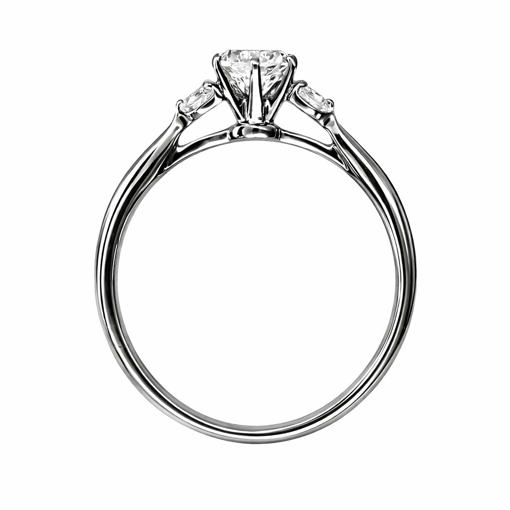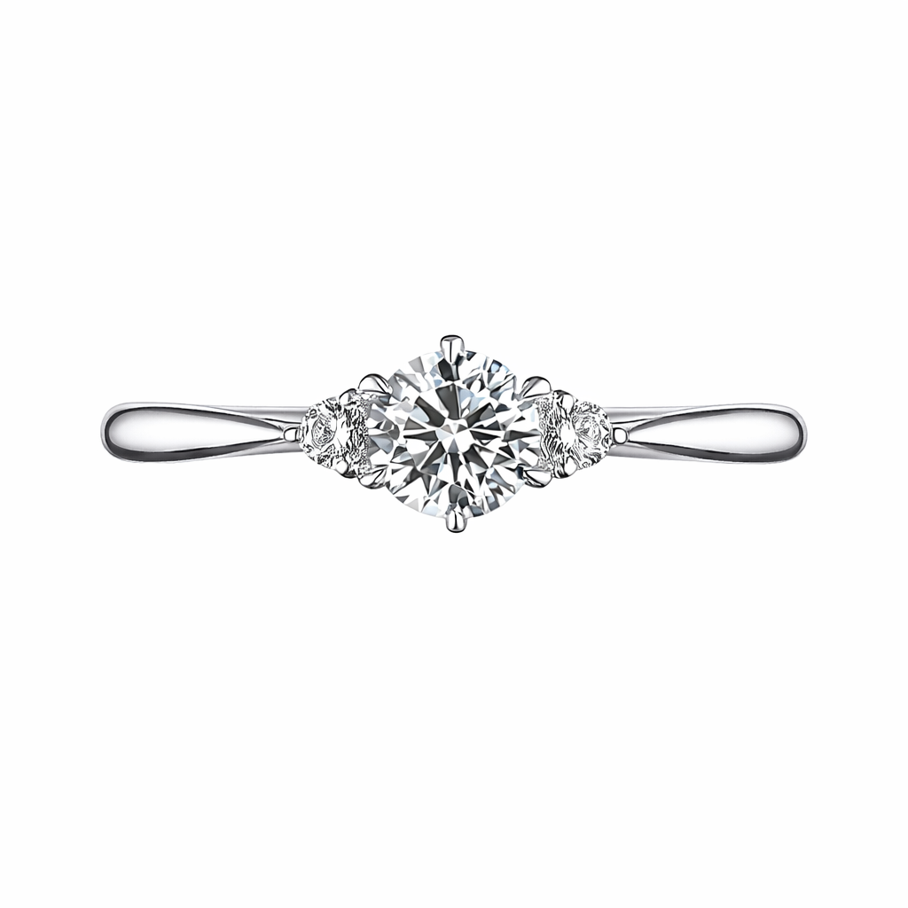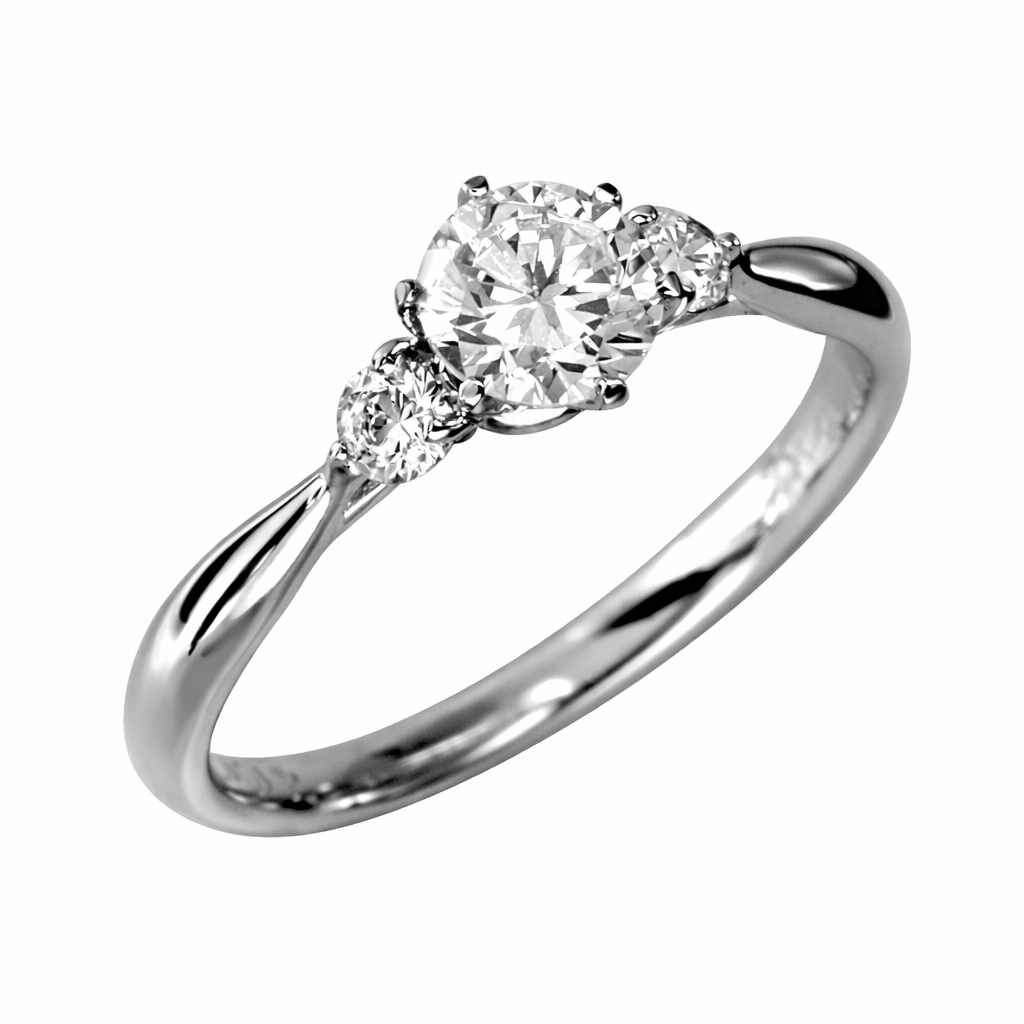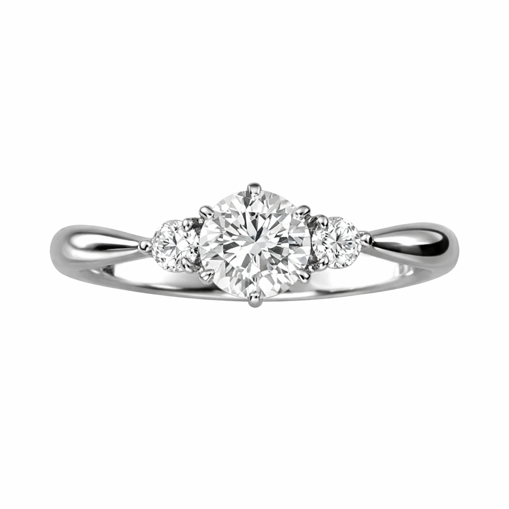 中央にはラウンドブリリアントカットのダイヤモンドをセッティングし、両サイドに1石ずつ脇石ダイヤを添えたデザイン。