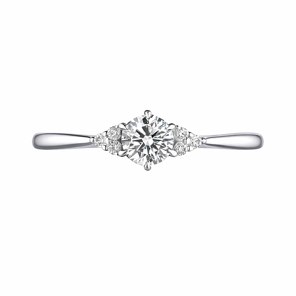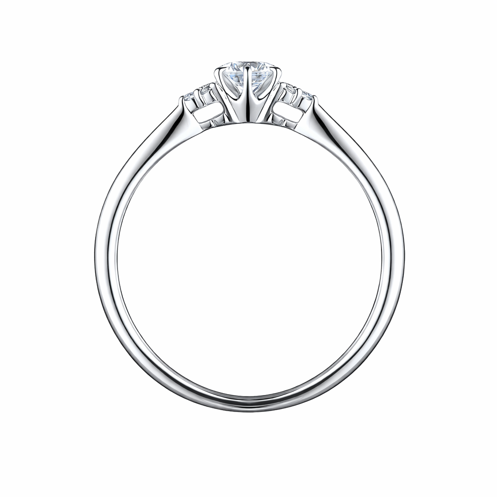 センターダイヤモンドを、両サイドのダイヤがやさしく引き立てる美しいデザイン。